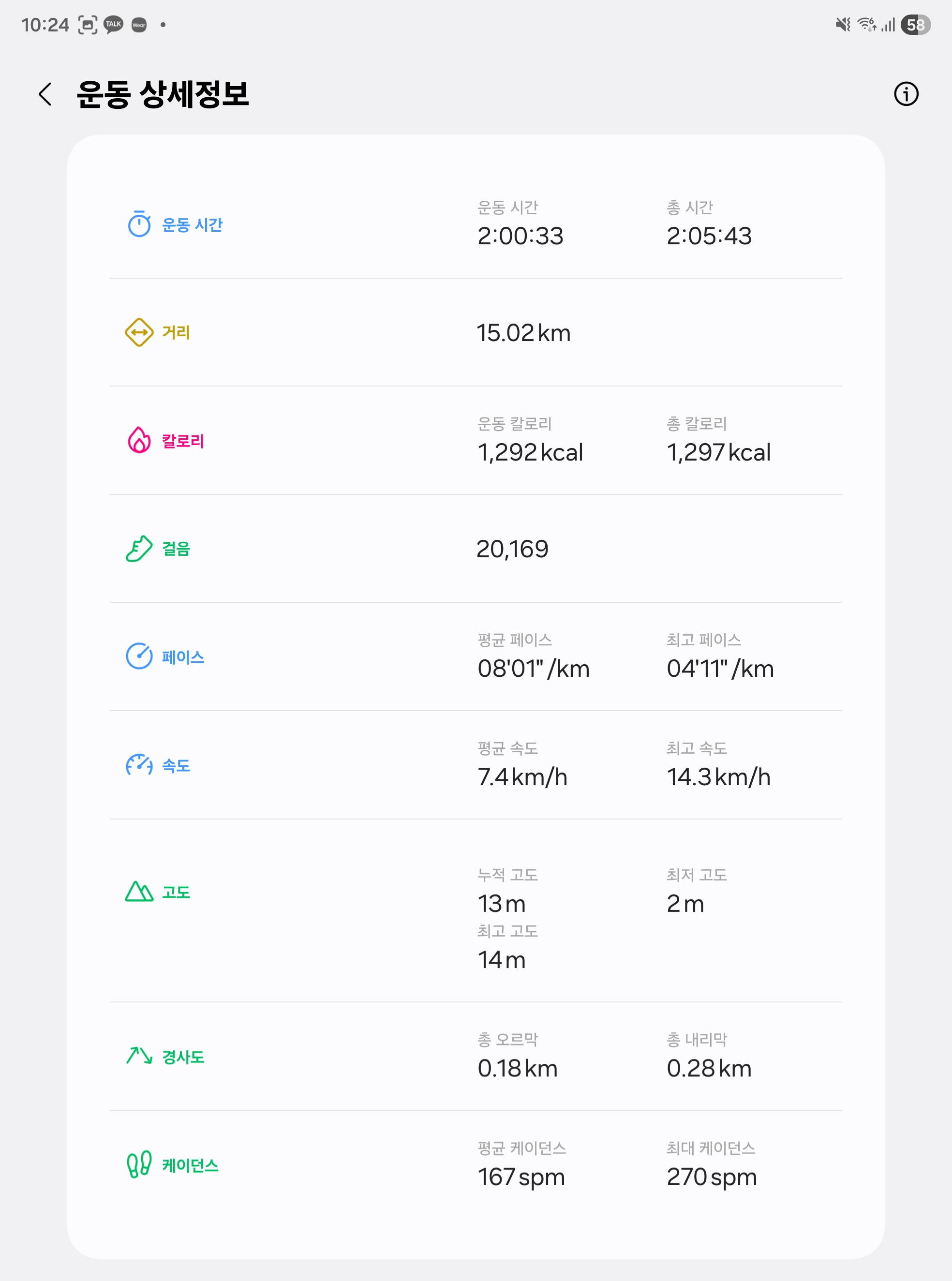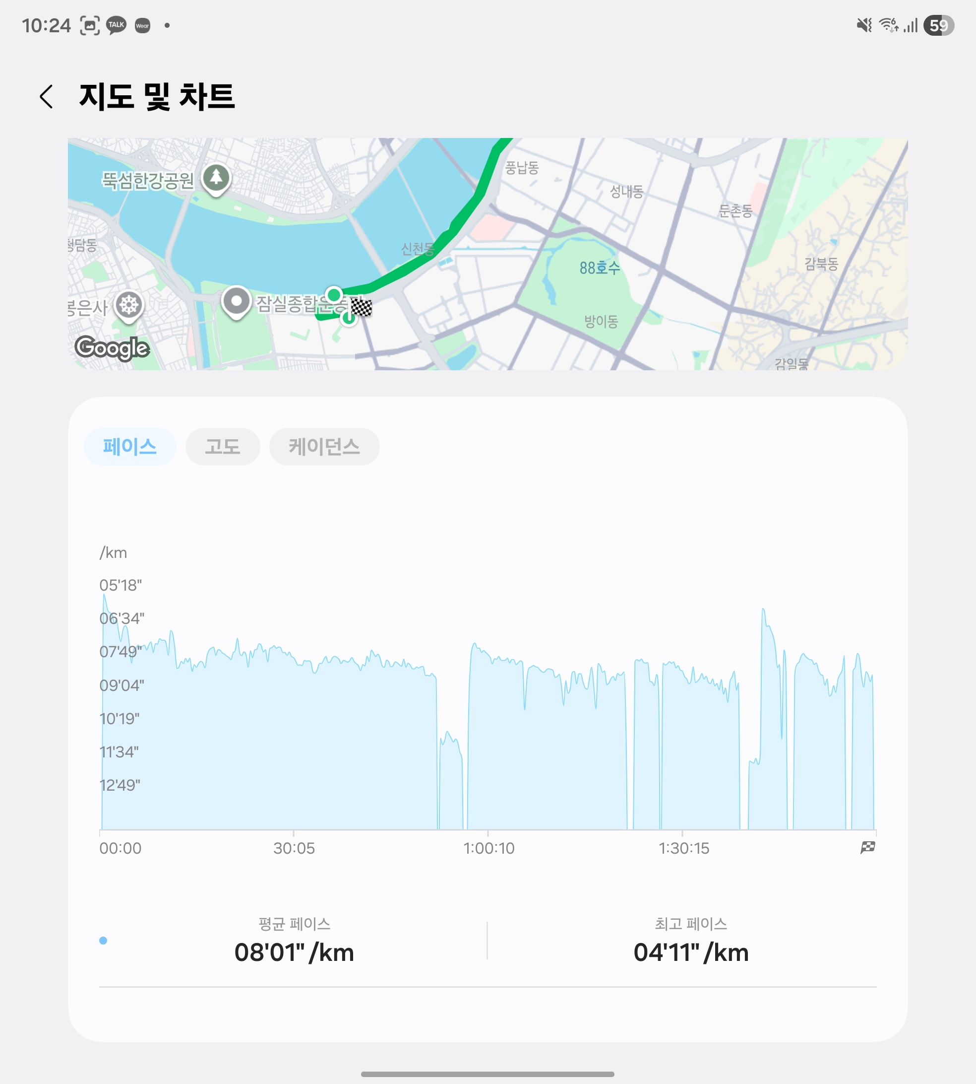 12km 정도 즈음부턴 힘들면 조금씩 걷고 뛰고를 반복했다. 몸이 힘들다고 느낄 때 기를 쓰고 뛰어봐야 결국 부상만 입게 된다는 걸 알게 된 후부터는 무리하지 않으려고 한다. 중간에 페이스가 확 떨어지는 부분들이 걸은 부분들인 거 같다. 중간에 화장실도 한번 다녀왔다.