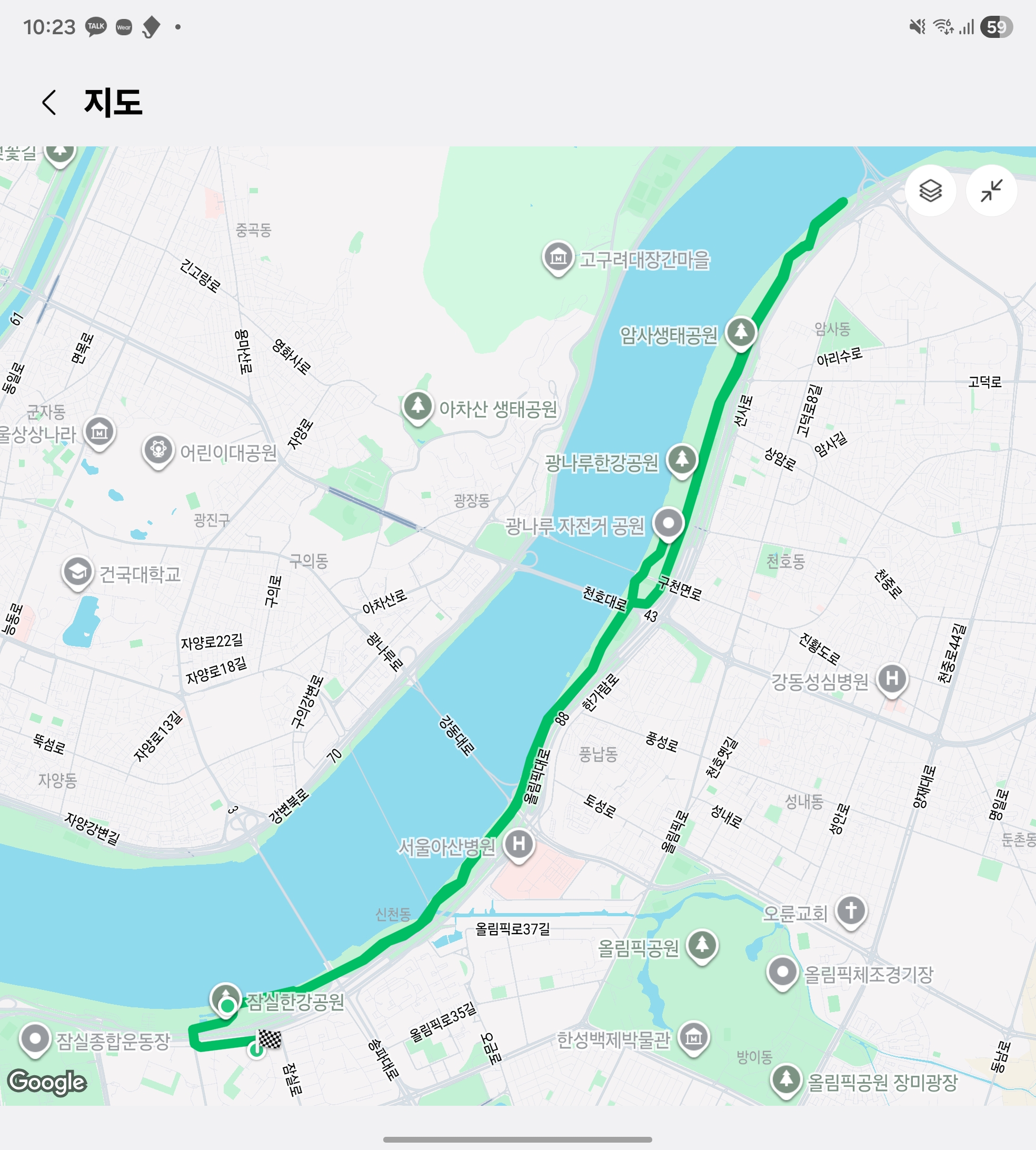 잠실 선착장에서 시작하여 잠실대교를 지나 잠실철교, 올림픽대교, 천호대교를 지나 구리암사대교를 찍고 다시 잠실 선착장으로 돌아오는 코스다. 이 코스는 내가 좋아하는 코스인데, 처음 러닝을 시작할 무렵부터 [잠실 - 한강대교] 코스보다 [잠실 - 구리암사대교] 코스가 더 재밌고 즐거웠다. 날이 따뜻해지면 [잠실-한강대교] 코스는 너무 번잡한데 비해 [잠실 - 구리암사대교] 코스는 아주 한적한 편이다. 그리고 봄에는 장미축제도 하는지 여러 색의 장미들도 있고, 중간중간 재밌는 곳이 많아서 좋아한다. 아무튼 사람들 북적대는 건 질색이다.
